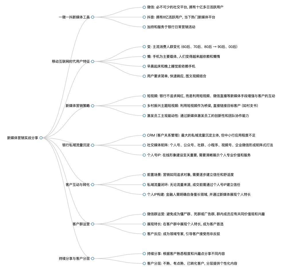 银行的私域流量可以通过CRM等平台进行沉淀,其中CRM是主要的沉淀主体。然而,许多中小银行在CRM的重视和应用程度上仍有待提升。在进行精准营销和客户分类建档时,CRM的作用尤为明显。同时,社交媒体如微信的个人号、公众号、社群、小程序、视频号和企业微信等,与CRM形成矩阵式的打法,共同构成私域流量的主要沉淀池。微信虽然作为第三方平台,但因其庞大的社交体量,成为私域流量沉淀的关键渠道。此外,个人号的IP建设对于私域流量转化至关重要,需打造专业的形象和提供明确的价值信息,以便客户在添加微信时能清楚了解服务内容。最终,私域流量的运营目标是促成用户成交,而这一过程需要通过前置场景和互动来实现。