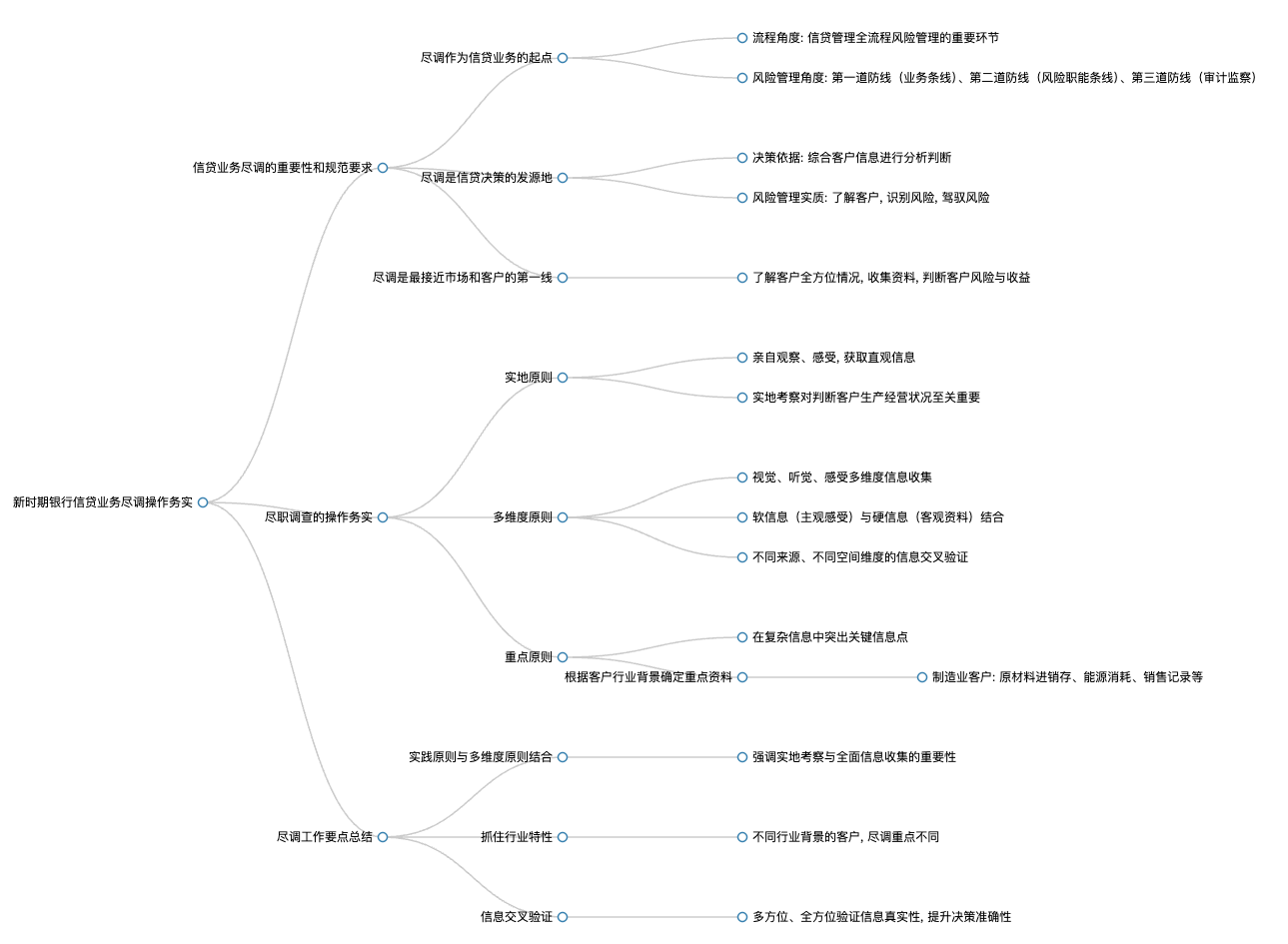 强调尽职调查在银行信贷业务中的核心地位,它是全流程风险管理的关键,直接影响信贷决策质量。尽调工作需遵循实地、多维度和重点原则,实地原则注重面对面交流和现场观察,多维度原则要求全面交叉验证信息,重点原则强调在海量信息中识别关键点。尽调作为第一道防线,贯穿信贷业务全过程,与风险职能和审计监察条线共同构建风险管理体系。