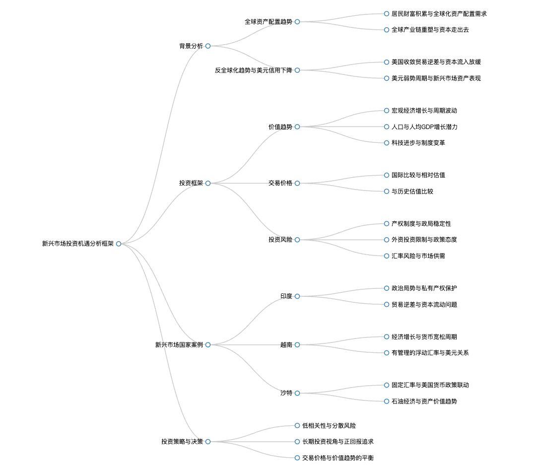 评估新兴市场投资机会需结合经济增长能力、货币政策周期(价值趋势)、估值(是否过贵或过便宜,对比历史和国际水平)以及产权制度、对外资态度等风险因素(尤其是超长期投资中)。通过构建这样的思维框架,投资者可以在把握机会的同时更好地控制风险,并帮助客户做出更完善的投资决策。